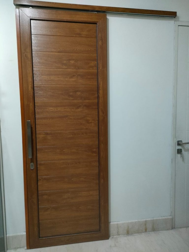 Pintu Single Slide Urat Kayu dari Kusen UPVC